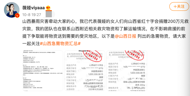 #薇婭為山西捐款200萬(wàn)元#、#薇婭公益#、#山西暴雨#