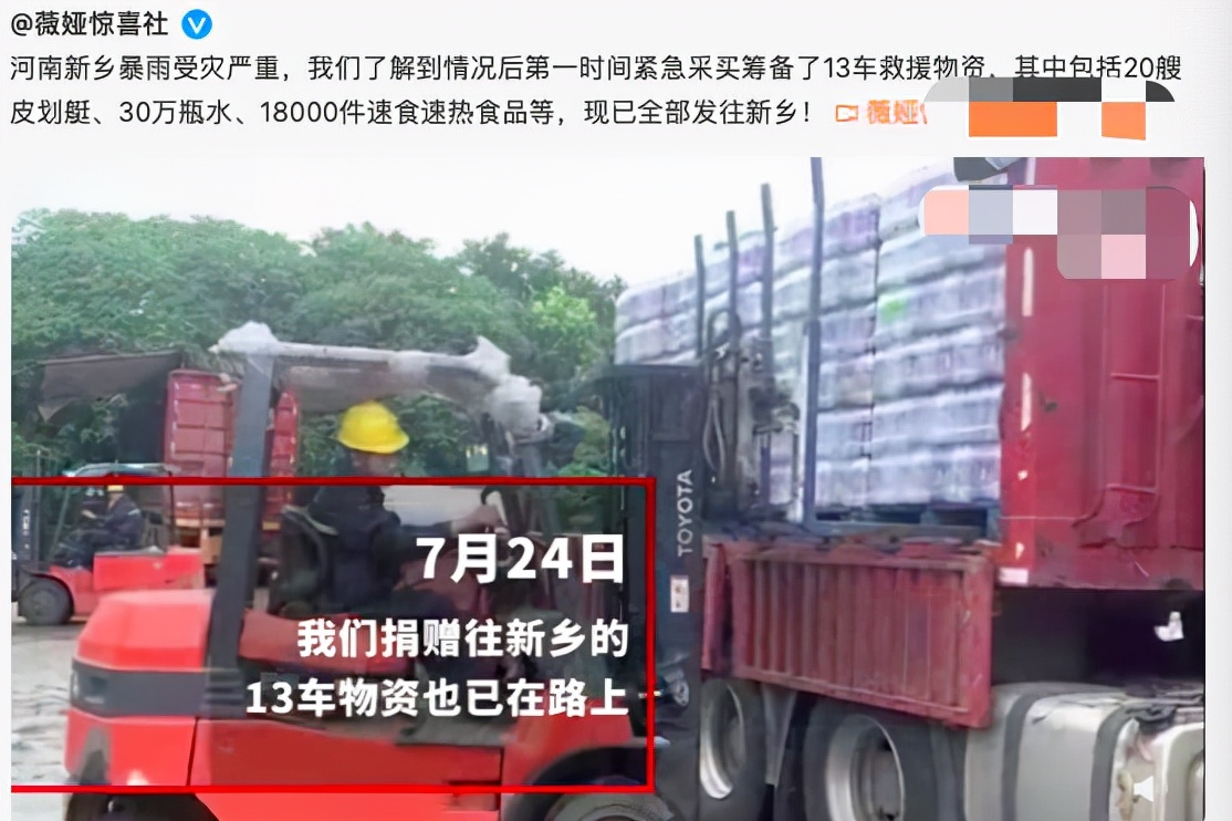 此前河南突發(fā)暴雨,薇婭就直接捐款200萬(wàn)元人民幣,并在第一時(shí)間籌備了13車(chē)救援物資,其中包括20艘皮劃艇、30萬(wàn)瓶水以及18000件速食速熱食品。