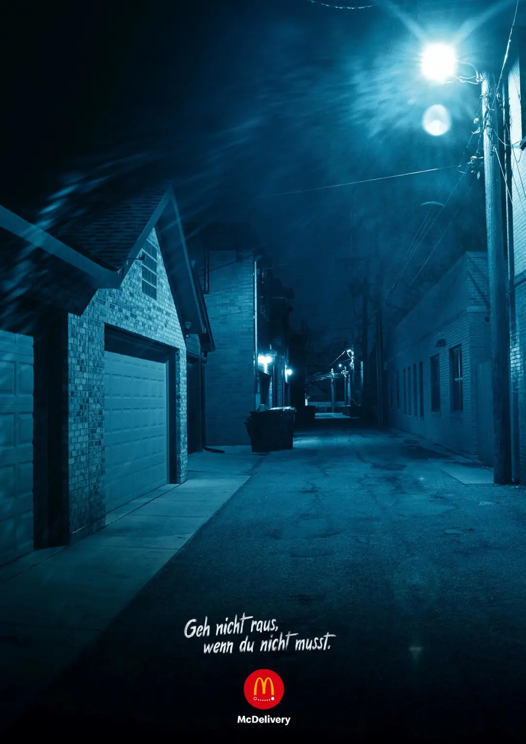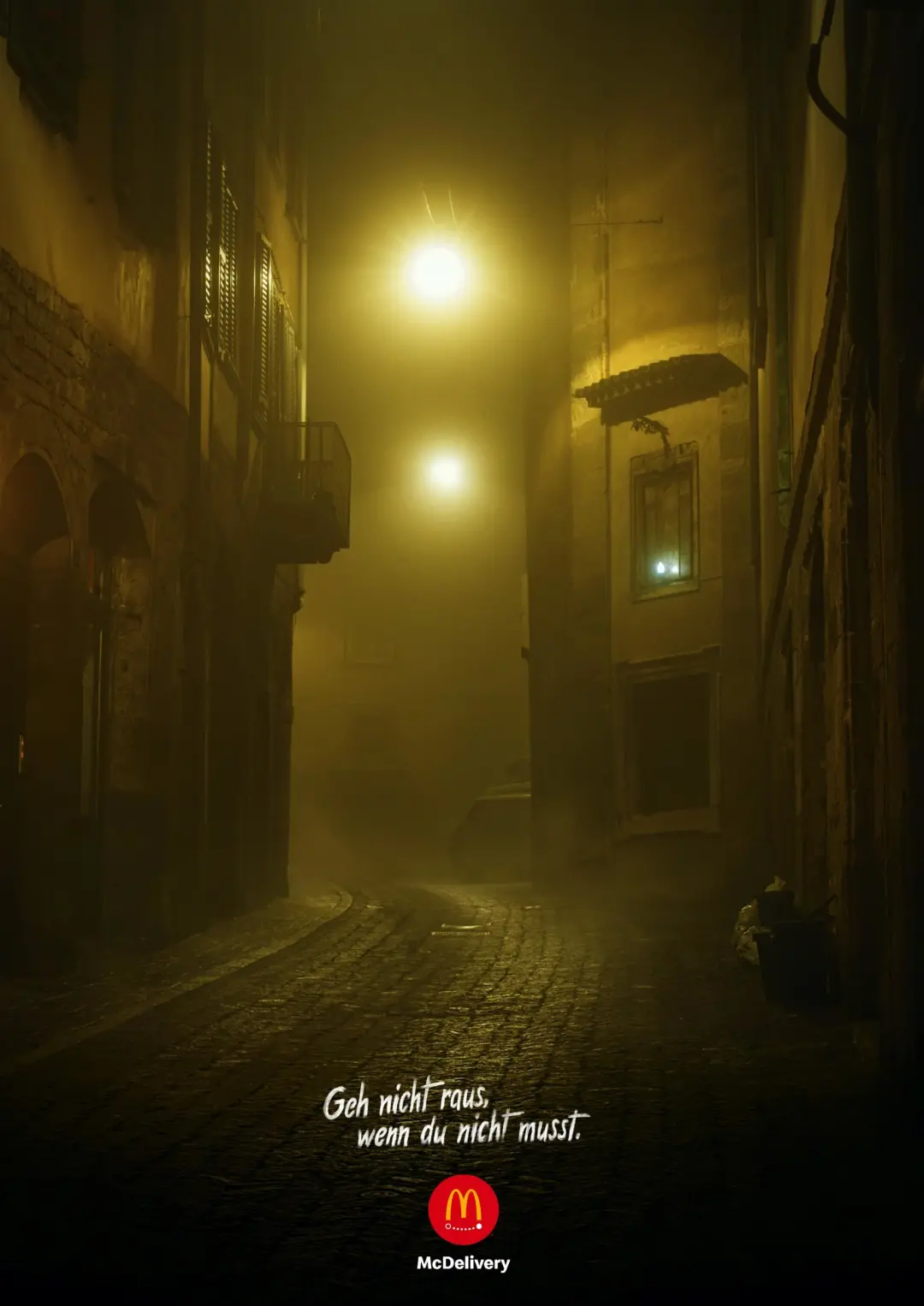 點(diǎn)評(píng):萬(wàn)圣節(jié)期間,麥當(dāng)勞奧地利發(fā)布了節(jié)日海報(bào)。空無(wú)一人的街景、飄渺虛幻的燈光、再配上“geh nicht raus, wenn du nicht musst”(如果沒(méi)有必要,請(qǐng)不要外出)的文案,恐怖氣氛瞬間拉滿。既渲染了節(jié)日氣氛,還體現(xiàn)了貼心的外送服務(wù),形成品牌和“節(jié)”之間的強(qiáng)關(guān)聯(lián),不愧是麥當(dāng)勞~
