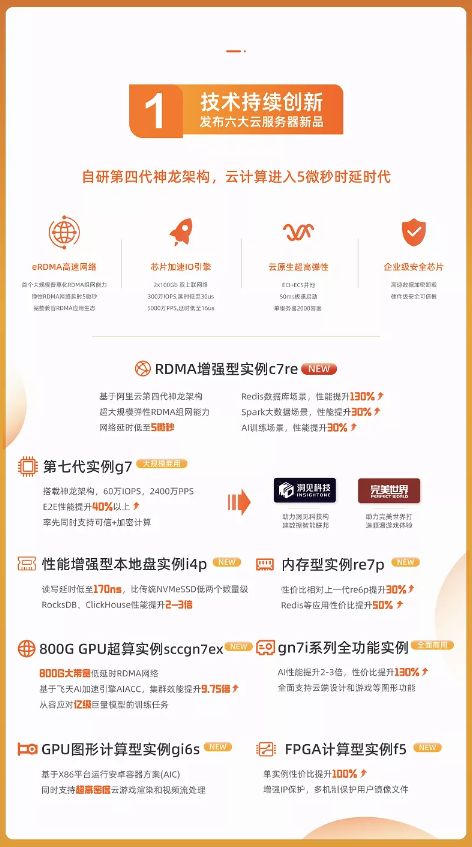 此次峰會上,基于阿里云自研的神龍架構(gòu),阿里云重磅發(fā)布了RDMA增強型實例c7re、800G GPU超算實例sccgn7ex、FPGA計算型實例f5、GPU圖形計算型實例gi6s、性能增強型本地盤實例i4p等多款云服務(wù)器新品,解決企業(yè)在數(shù)字經(jīng)濟(jì)時代的數(shù)據(jù)密集型計算痛點。