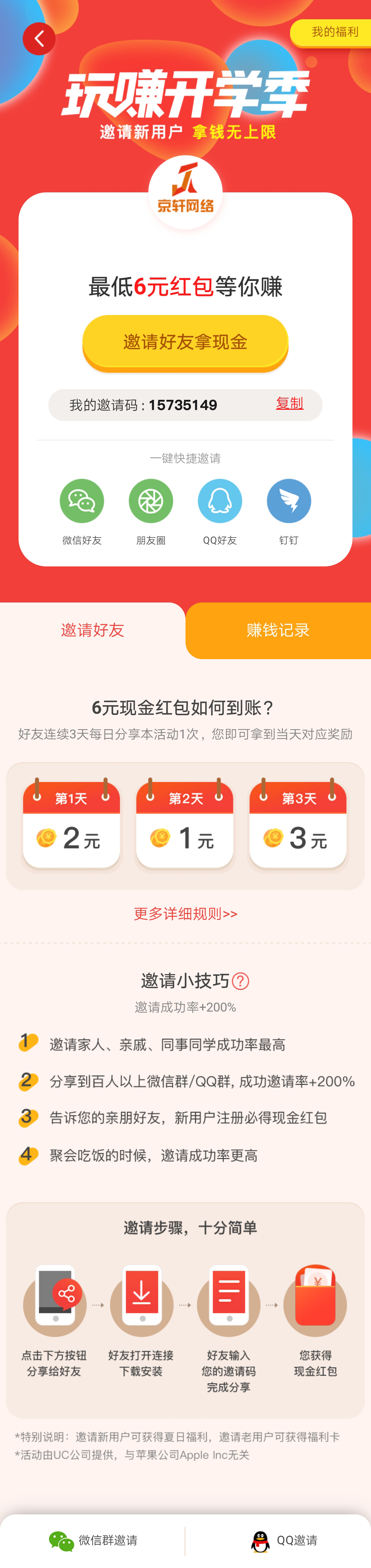 點擊活動頁面的邀請好友拿現(xiàn)金”按鈕,選擇微信/朋友圈/QQ等方式,把活動分享給自己的好友。
