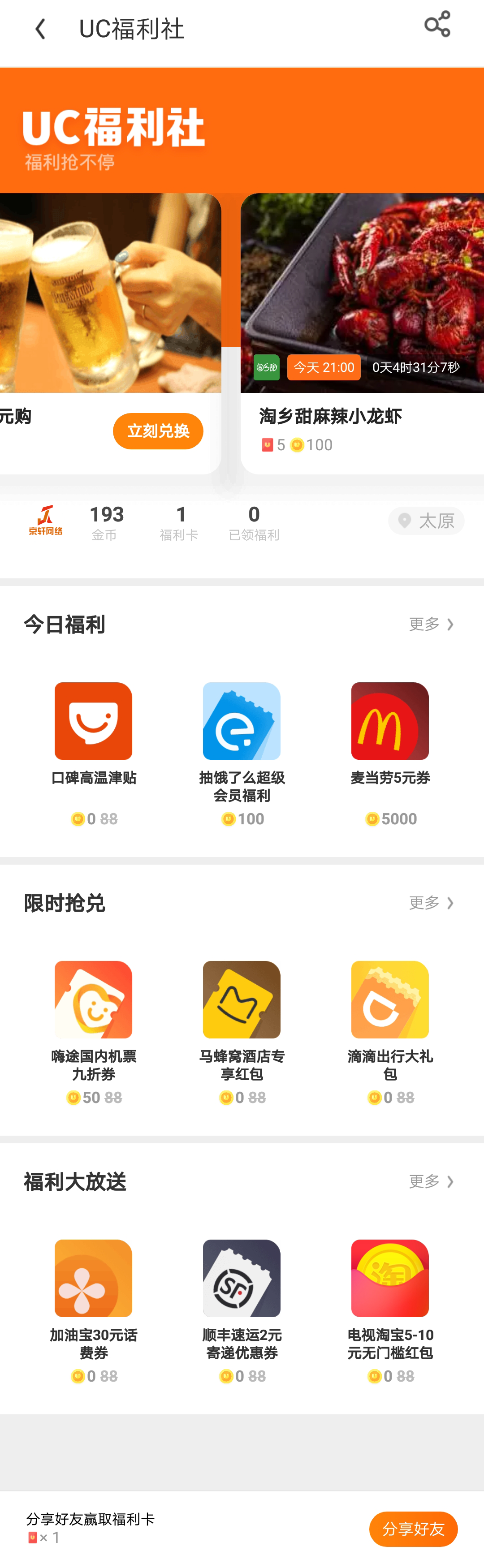 好友是老用戶,您獲得1張福利券。福利券可在個人中心UC福利社兌換麻辣小龍蝦等超值獎勵。