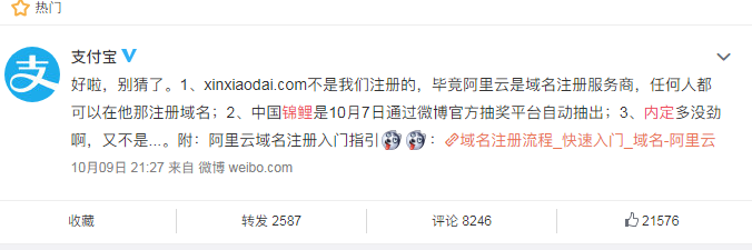 轉(zhuǎn)發(fā)支付寶的【祝你成為中國(guó)錦鯉】的微博,支付寶將會(huì)在10月7日抽出一位集全球獨(dú)寵于一身的幸運(yùn)者,領(lǐng)取一份超級(jí)大禮包。