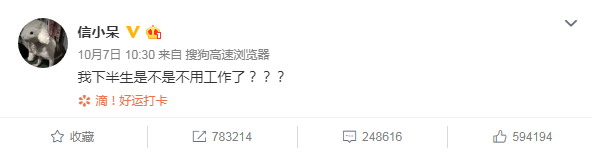 “中國(guó)錦鯉"本人@信小呆,獲獎(jiǎng)后發(fā)布了一則微博"我下半生是不是不用工作了?"網(wǎng)友紛紛打卡錦鯉,@信小呆微博賬號(hào)漲粉數(shù)十萬(wàn),目前粉絲已超60萬(wàn)。