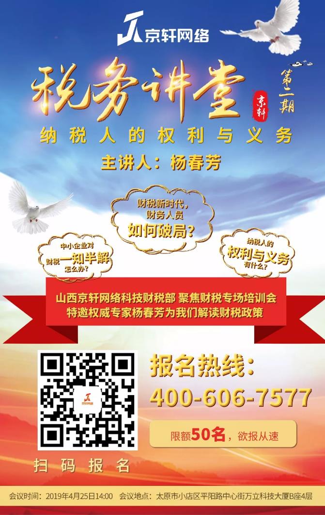 不過,財務(wù)人員不要著急,山西京軒網(wǎng)絡(luò)科技有限公司主辦的【稅務(wù)課堂】,旨在解您燃眉之急,助您一臂之力,我們每月定期都有稅務(wù)專場培訓會,特邀資深財稅專家深度解讀財稅政策,為您的職業(yè)發(fā)展“充電”。