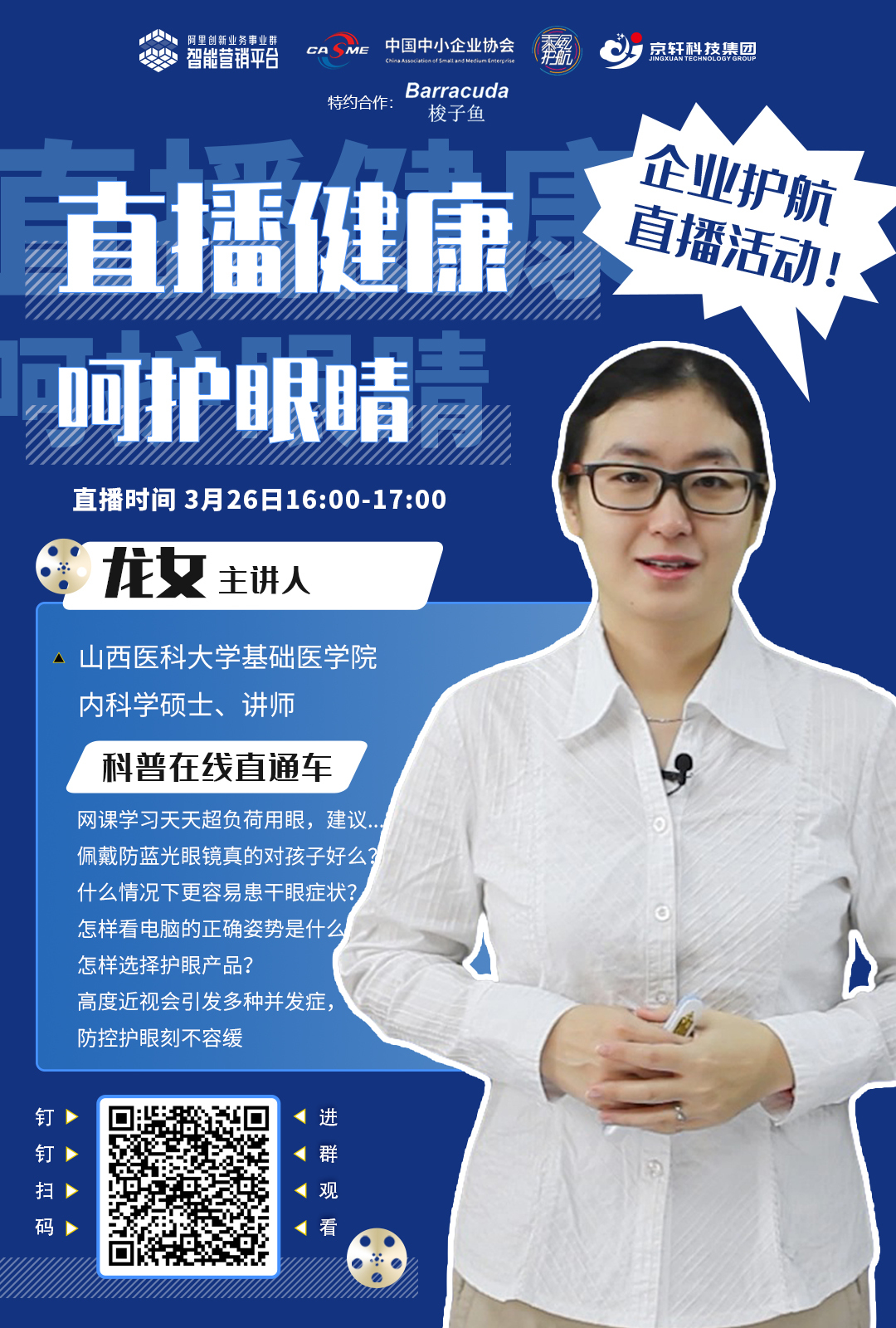 本期企業(yè)護(hù)航公益直播課程特邀山西醫(yī)科大學(xué)醫(yī)學(xué)院講師龍女,在線科普用眼健康小知識(shí),防控護(hù)眼刻不容緩。