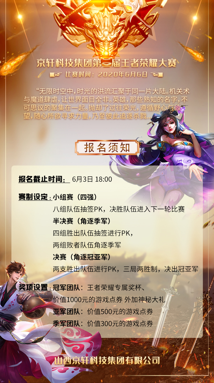 京軒科技集團(tuán)第三屆王者榮耀大賽將于2020年6月6日