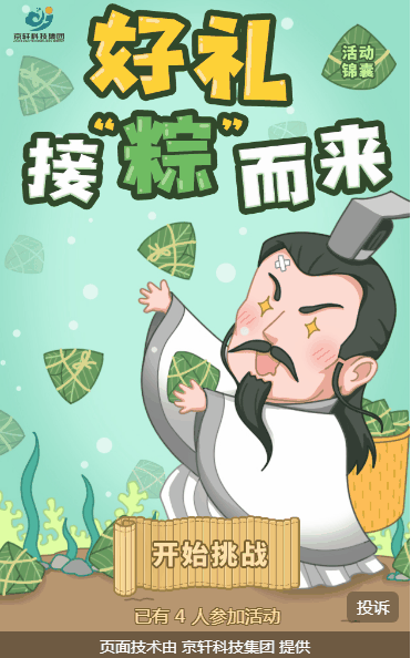 艾草青青,時光悄悄步入端午 端午小長假你準備怎么度過? 在家睡到自然醒? 看劇吃粽刷抖音? 不不不 這樣的度過方式 未免太對不起一年一度的端午佳節(jié) 來了解一下正確的打開方式 一、游戲分數(shù)達到180分即可參與抽獎; 二、每人每天可獲得三次抽獎機會; 三、參與游戲抽獎的小伙伴須填寫真實姓名及電話,方便后續(xù)獎勵發(fā)放; 四、活動結(jié)束后工作人員將第一時間與您聯(lián)系,通過電話告知您獎品如何兌換; 五、本次活動最終解釋權(quán)歸山西京軒科技集團有限公司所有。 方式一:長按上方二維碼,關(guān)注“京軒企業(yè)服務(wù)站”公眾號,即可參與活動; 方式二:“京軒企業(yè)服務(wù)站”微信公眾號菜單欄,點擊“接粽子”參與活動。 注:獎品請以實物為準 端午大禮盒 200神馬幣 京軒智推產(chǎn)品專享1000元消費券 產(chǎn)品短視頻免費拍攝 京軒智推互動游戲搭建 你喜歡這樣的“端午節(jié)”打開方式嗎? 更多線上互動小游戲 皆在“京軒智推” 接“粽”而來的大福利 你還不去接嗎??