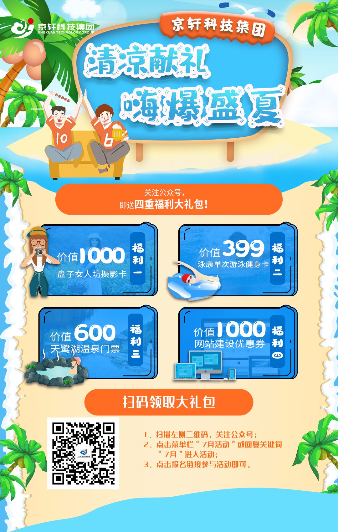 小暑已過,時(shí)光步入盛夏時(shí)節(jié) 熱浪席卷,大地逐漸被炙烤 身體充斥著被降溫的期待 值此盛夏之際 京軒科技集團(tuán)清涼獻(xiàn)禮 讓夏日邂逅清涼,帶你嗨爆盛夏! 京軒科技集團(tuán)夏日清涼獻(xiàn)禮 價(jià)值1000元定制拍攝券 可拍攝古裝寫真一套 泳康運(yùn)動(dòng) 價(jià)值399元體驗(yàn)券 可享受游泳+健身項(xiàng)目 天鷺湖溫泉 價(jià)值600元溫泉門票 京軒智推 價(jià)值1000元網(wǎng)站建設(shè)消費(fèi)券 領(lǐng)取方式 活動(dòng)規(guī)則
