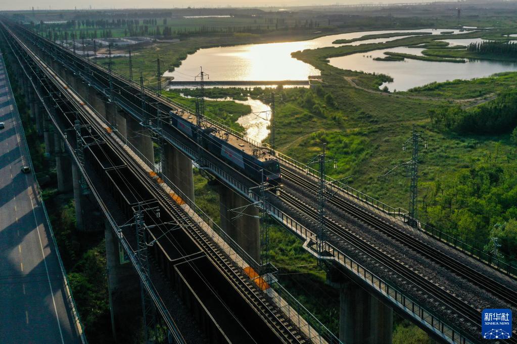 重載列車行駛在大秦鐵路上(2022年7月16日攝,無人機照片)。為做好迎峰度夏能源保供工作,中國鐵路太原局集團有限公司在確保運輸安全的前提下全力提升煤炭運量。