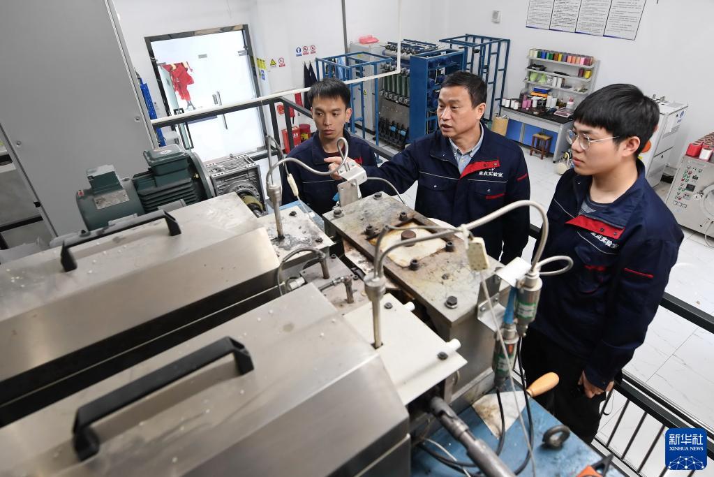 福建閩江學(xué)院服裝與藝術(shù)工程學(xué)院教授李永貴(中)在“福建省新型功能性紡織纖維及材料重點(diǎn)實(shí)驗(yàn)室”教學(xué)生做紡絲實(shí)驗(yàn)(2021年3月22日攝)。