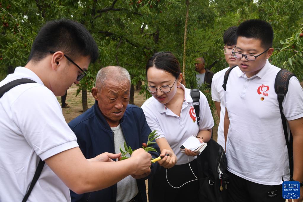 中國(guó)海洋大學(xué)紅旗智援博士團(tuán)成員在山東省樂(lè)陵市朱集鎮(zhèn)大常村棗林向果農(nóng)了解果樹(shù)種植情況(2019年9月19日攝)。