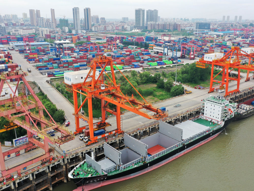 “華航漢亞2號”貨輪停靠在武漢新港陽邏集裝箱碼頭進(jìn)行裝箱作業(yè)(2020年5月9日攝,無人機(jī)照片)。