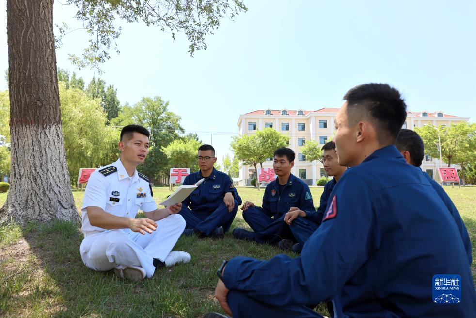 海軍某部飛行軍官劉嚴(yán)嚴(yán)(左一)和機(jī)務(wù)官兵分享學(xué)習(xí)心得(7月2日攝)。
