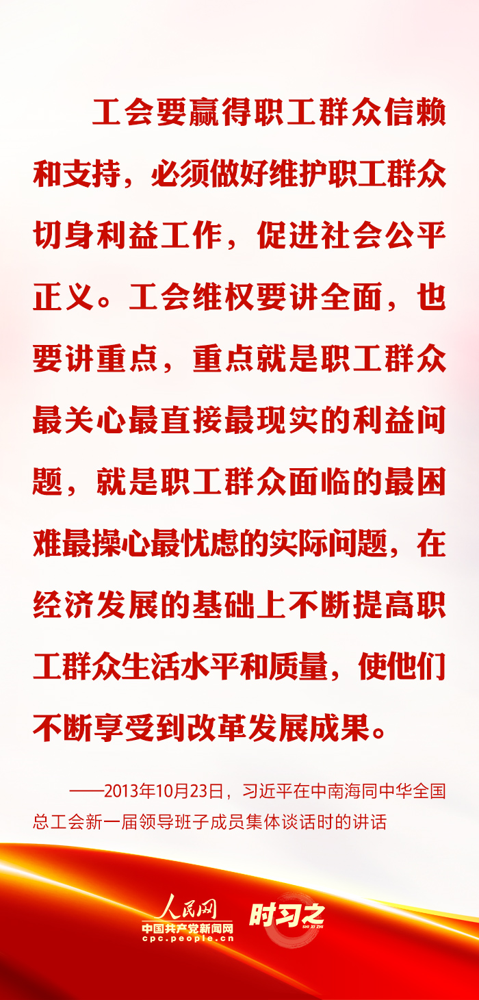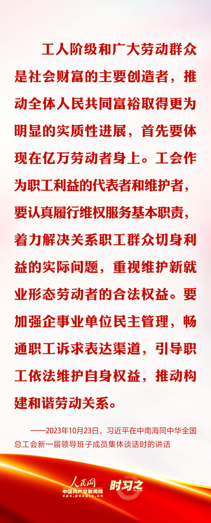 2023年10月23日下午,習(xí)近平總書記在中南海同中華全國總工會(huì)新一屆領(lǐng)導(dǎo)班子成員集體談話并發(fā)表重要講話。他強(qiáng)調(diào),工會(huì)作為職工利益的代表者和維護(hù)者,要認(rèn)真履行維權(quán)服務(wù)基本職責(zé),著力解決關(guān)系職工群眾切身利益的實(shí)際問題,重視維護(hù)新就業(yè)形態(tài)勞動(dòng)者的合法權(quán)益。