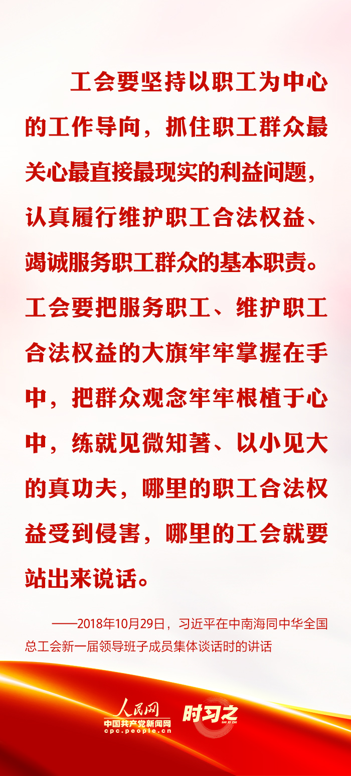 長期以來,習(xí)近平總書記心系廣大職工群眾最關(guān)心最直接最現(xiàn)實(shí)的利益問題,多次強(qiáng)調(diào)“工會(huì)要堅(jiān)持以職工為中心的工作導(dǎo)向”。