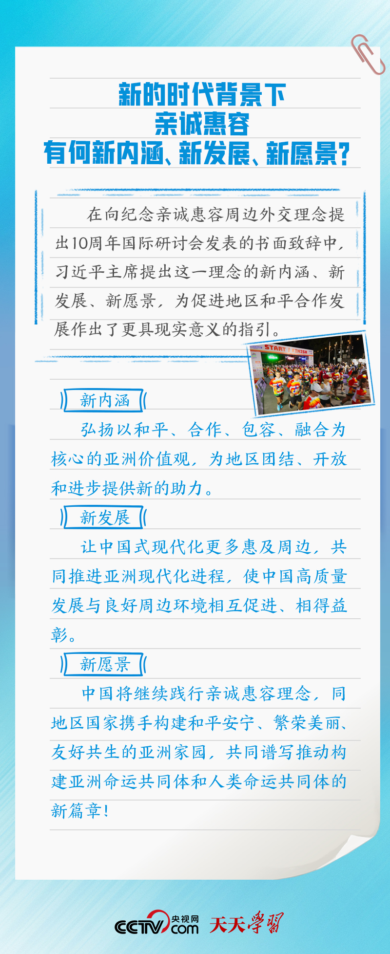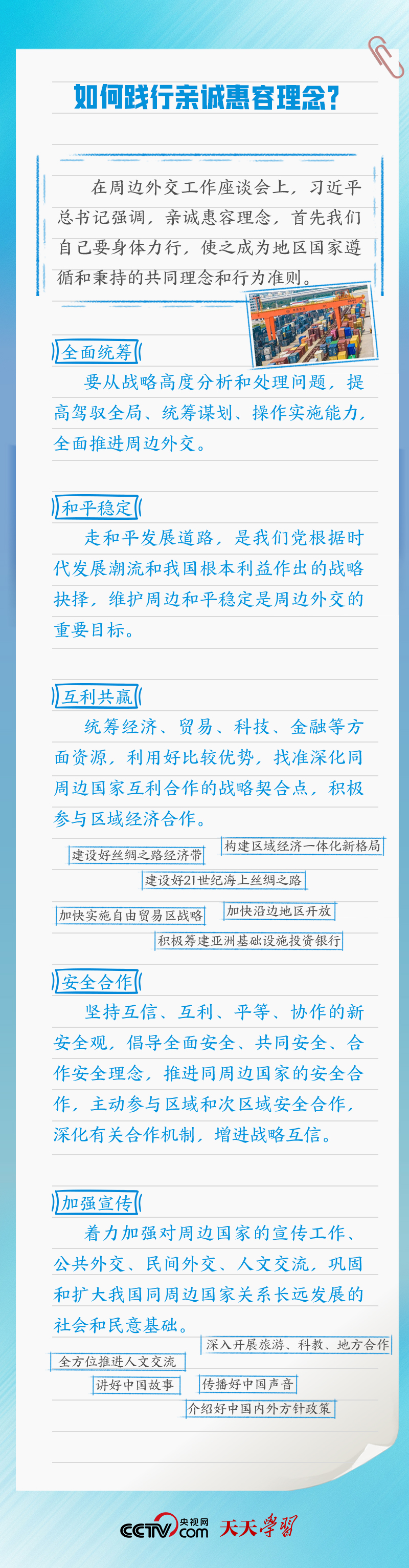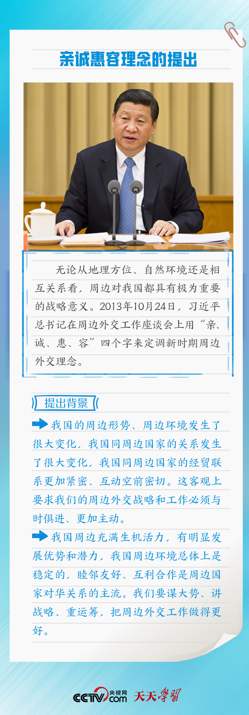 “親誠惠容”理念,源自多年來中國周邊外交實踐,是新形勢下中國堅持走和平發(fā)展道路的生動宣言。親誠惠容理念有何重要內(nèi)涵?如何踐行親誠惠容理念?央視網(wǎng)《天天學習》欄目特梳理相關(guān)內(nèi)容,與您一起學習。