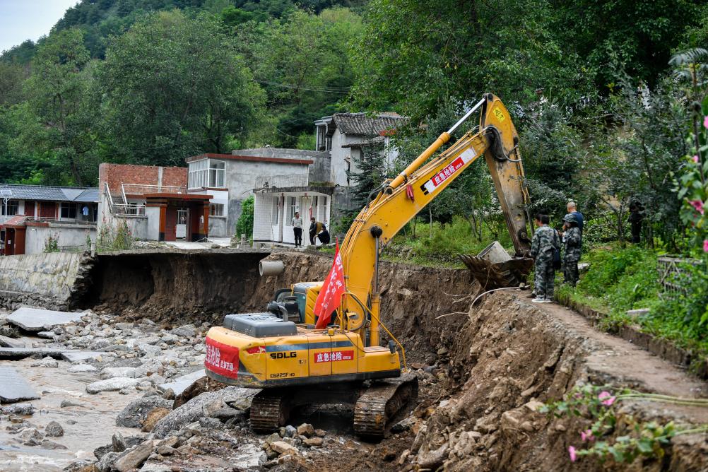 7月28日,在隴南市武都區(qū)黃坪鎮(zhèn)樓房壩村,黃坪鎮(zhèn)組織的搶險救援隊正在搶修受損農(nóng)村公路。