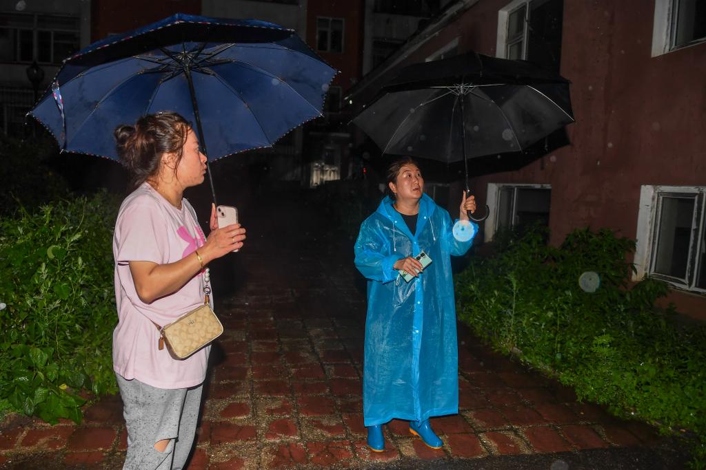 7月29日,在吉林省臨江市,建國街道臺興社區(qū)黨委書記孫愛武(右)和同事在怡景花園小區(qū)排查人員安置情況。